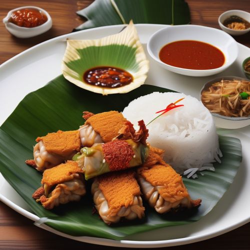 A popular street food from Bali, Indonesia. It is a small portion of rice served with various toppings and wrapped in banana leaves.