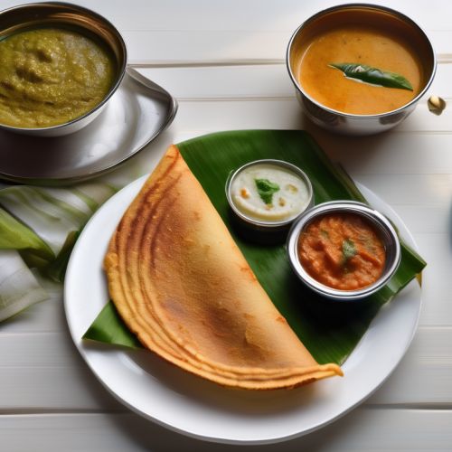 A delicious South Indian dish consisting of a crispy rice and lentil crepe filled with a spicy potato masala, served with sambar (a lentil and vegetable stew) and coconut chutney.