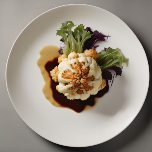 A flavorful and visually stunning vegetarian dish featuring a whole roasted cauliflower topped with caramelized celeriac-miso purée, spicy crouton crumbles, and a reduced dashi sauce.