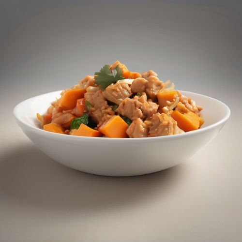 A delicious and healthy stir fry made with pumpkin, minced chicken, carrots, and onions.