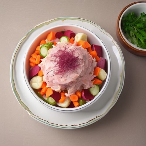 A traditional Russian salad made with beets, potatoes, carrots, pickles, and sauerkraut.