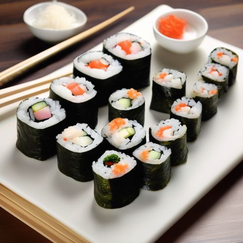 Delicious sushi rolls filled with crab stick and cream cheese, wrapped in nori seaweed and rice.