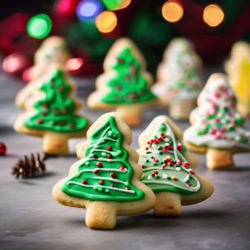 Delicious sugar cookies shaped like Christmas trees and decorated with frosting and sprinkles.