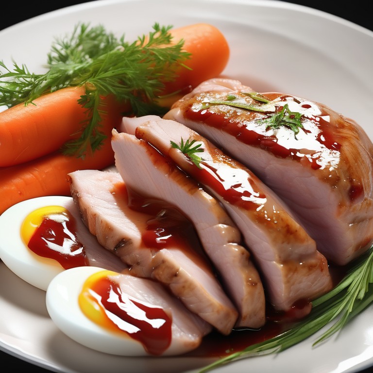 A delicious and flavorful pork dish with a tangy ketchup sauce, tender carrots, fresh herbs, and boiled eggs.