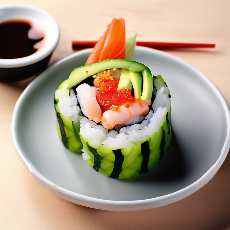A delicious Japanese sushi roll with a combination of different flavors and textures.