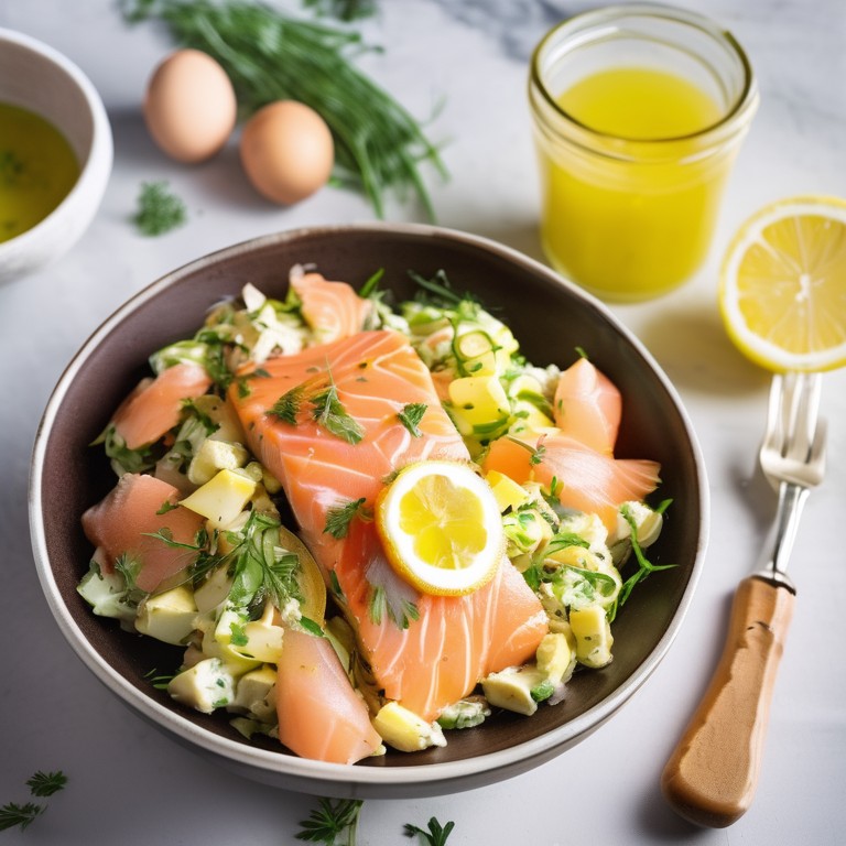 A delicious and nutritious salad with high protein content, featuring tender potatoes, boiled eggs, and savory smoked salmon.