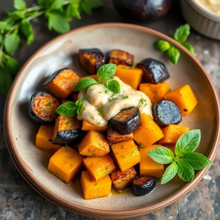 - Guarnición de Calabaza y Berenjena con Crema de Berenjena y Aderezos Creativos