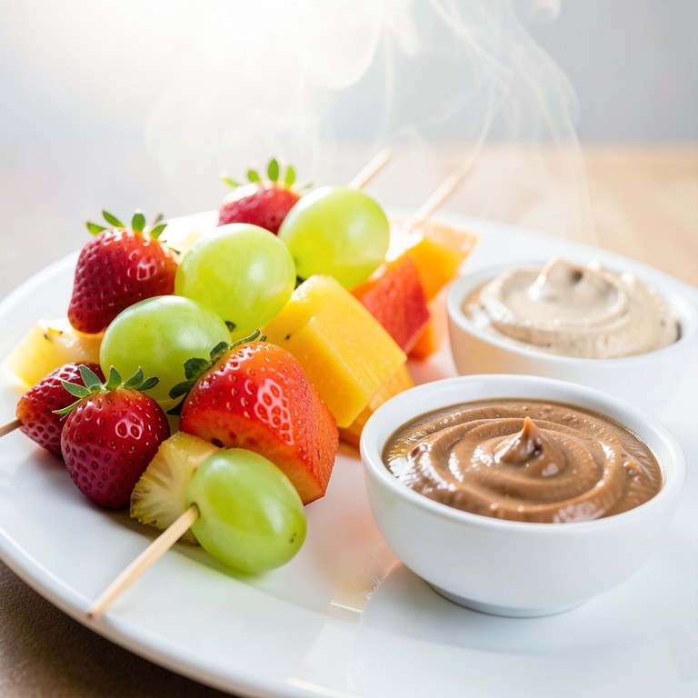- Brochetas de Fruta con Dúo de Dips Proteicos (Hummus y Mantequilla de Cacahuete)
