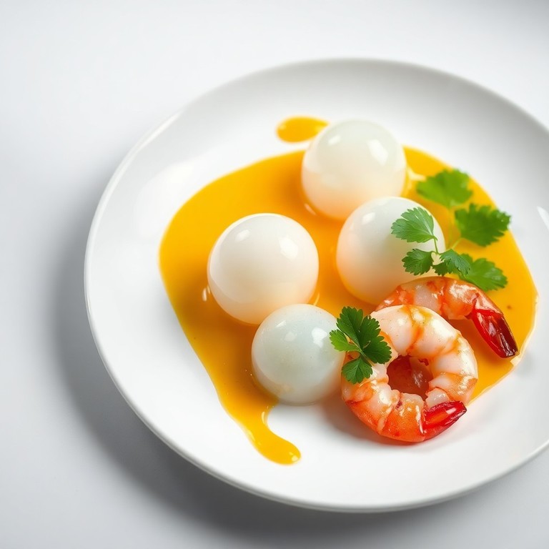 Camarones en Salsa de Mango y Ají en Esferas de Tilo y Yuca