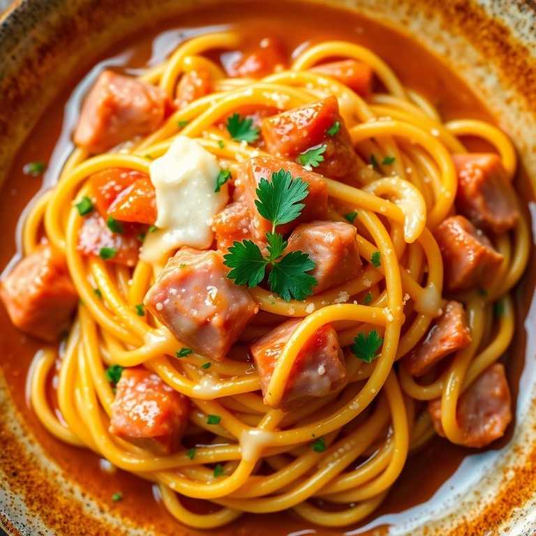 - Fideos con Salsa Agridulce, Jamón y Queso Tybo Fundido