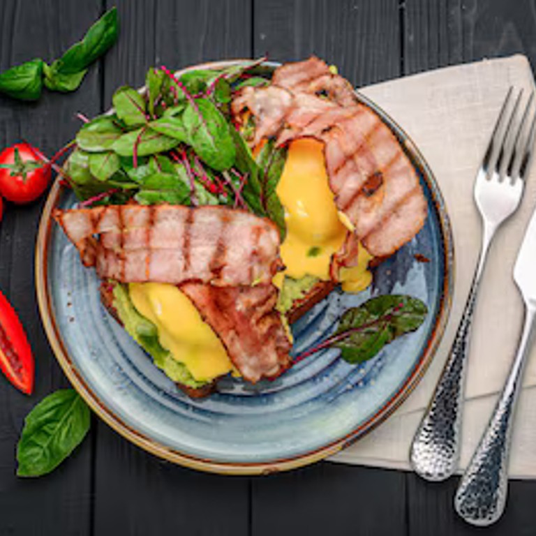 - Tostadas de Aguacate con Huevos Poché Salsa Holandesa y Tocino Crujiente
