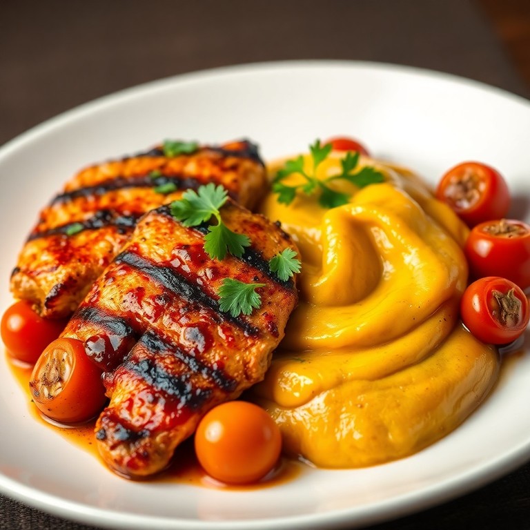- Pechugas a la parrilla con glaseado oriental, cherry confitado y plátano maduro gourmet
