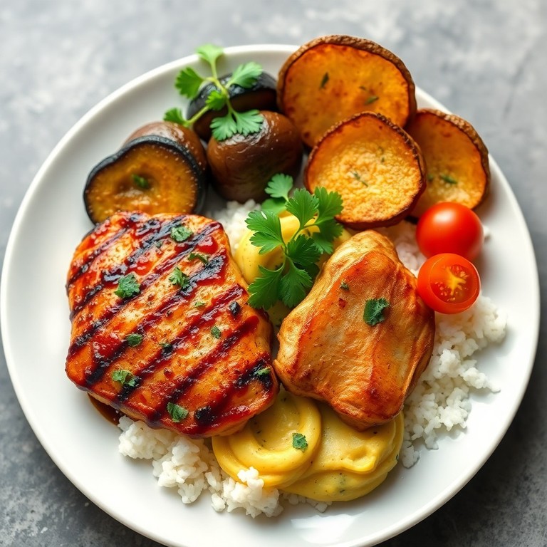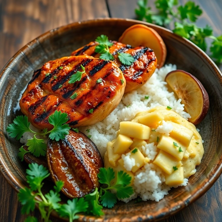 - Pechugas a la parrilla con glaseado oriental, plátano maduro creativo y arroz blanco