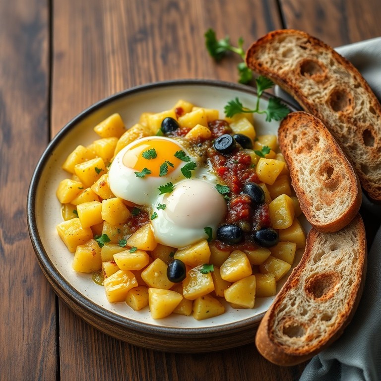 Revuelto de Patatas con Pasta de Aceitunas y Huevos Rotos