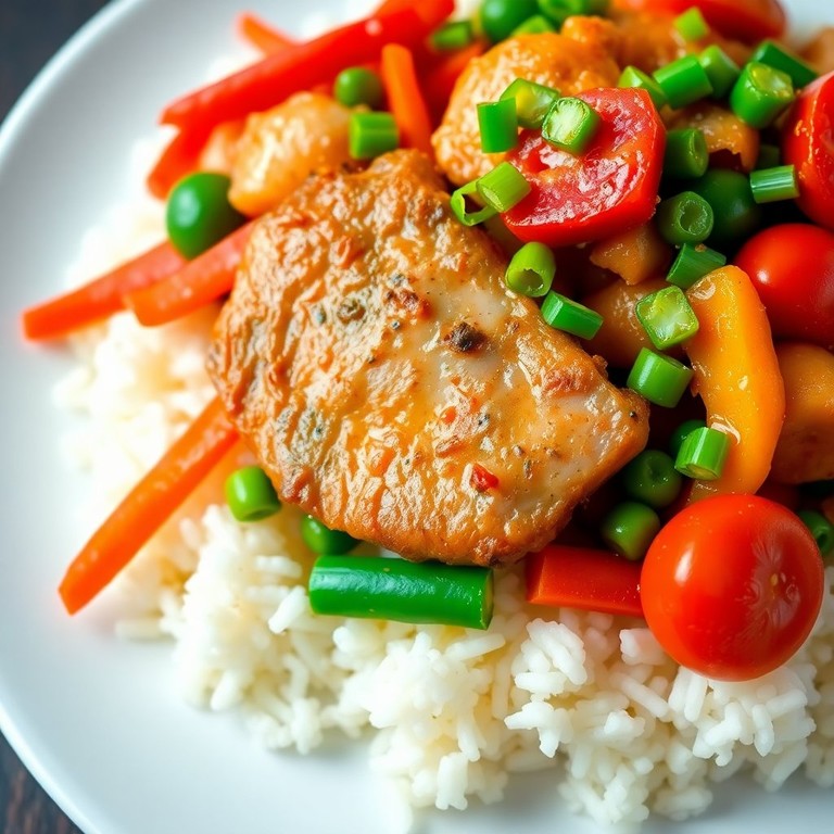 Salteado Vibrante de Verduras con Chuleta sobre Arroz