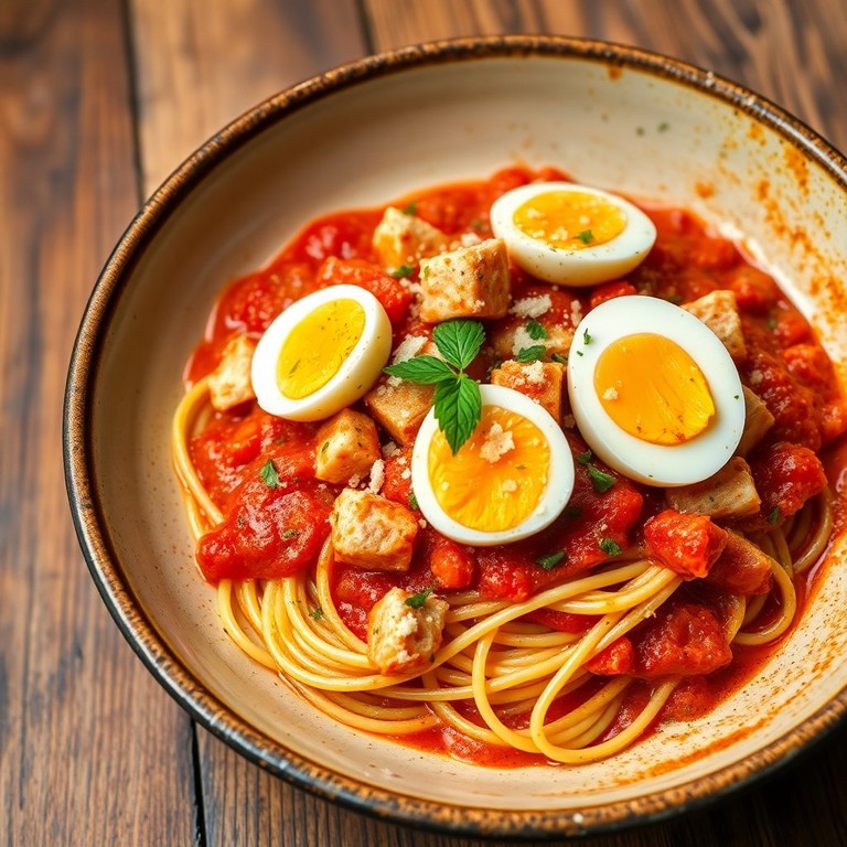Espaguetis Cremosos con Salsa de Tomate y Huevo Cocido