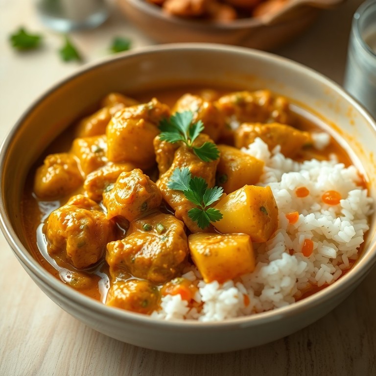 Guiso de pollo al curry con papas, cebolla y arroz blanco