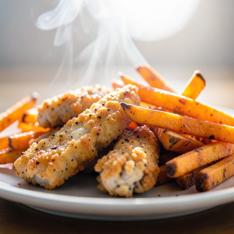 Tiras de Pollo Crujientes y Batatas Fritas en Freidora de Aire
