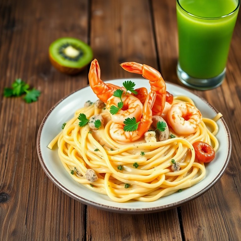 Pasta de Queso con Mariscos y Jugo de Kiwi