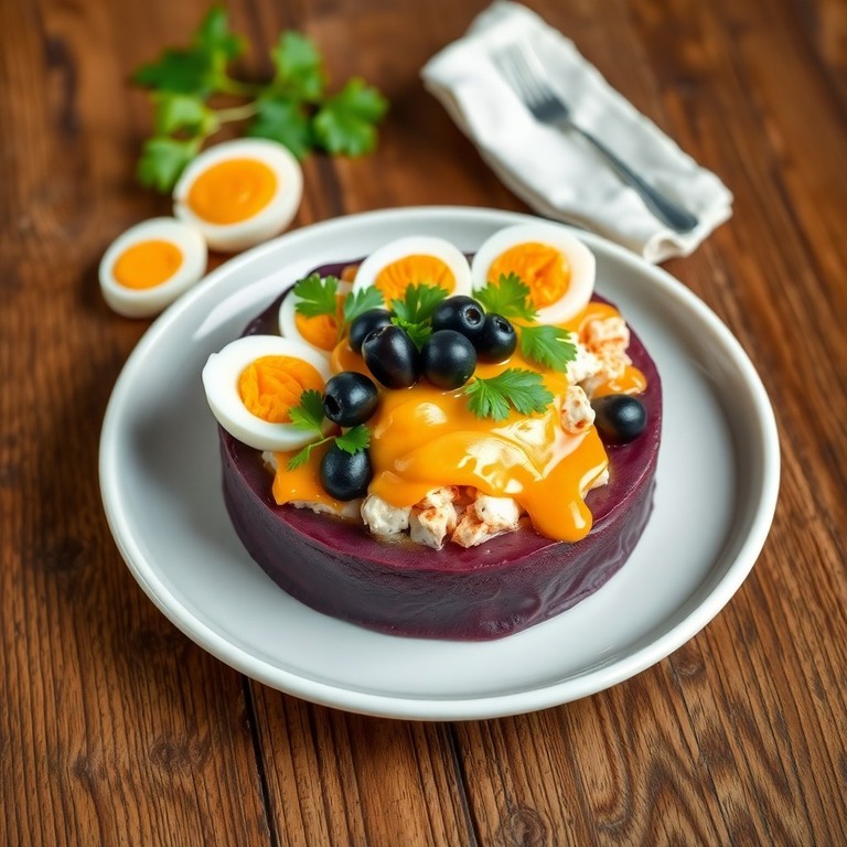 - Causa de Mashua Negra con Relleno de Cangrejo y Mayonesa Picante
