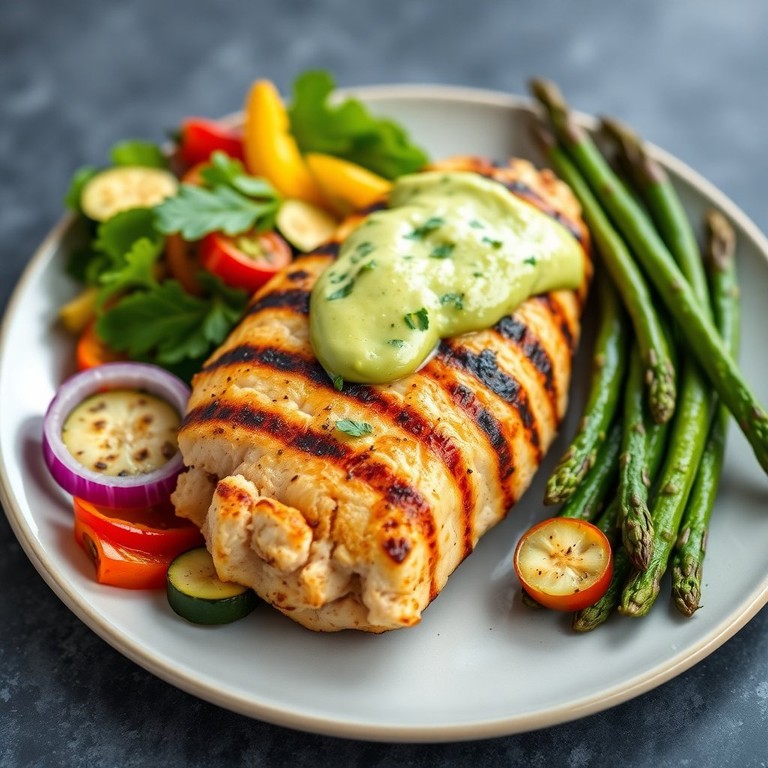 Pollo a la Parrilla con Salsa de Palta y Verduras Asadas