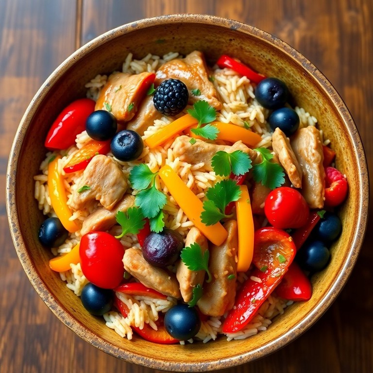 Arroz Salteado con Cerdo y Salsa de Frutas del Bosque