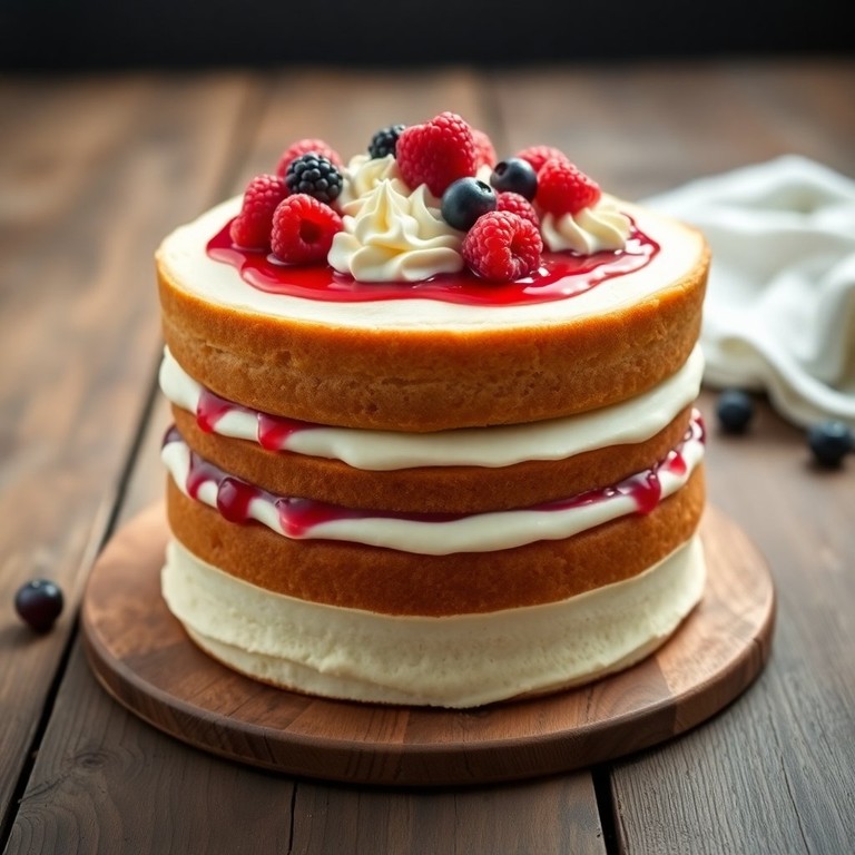 Pastel de Tres Biscochos de Vainilla con Relleno de Frutos Rojos