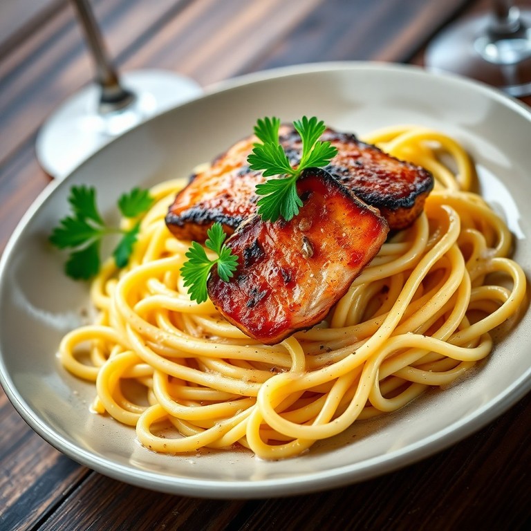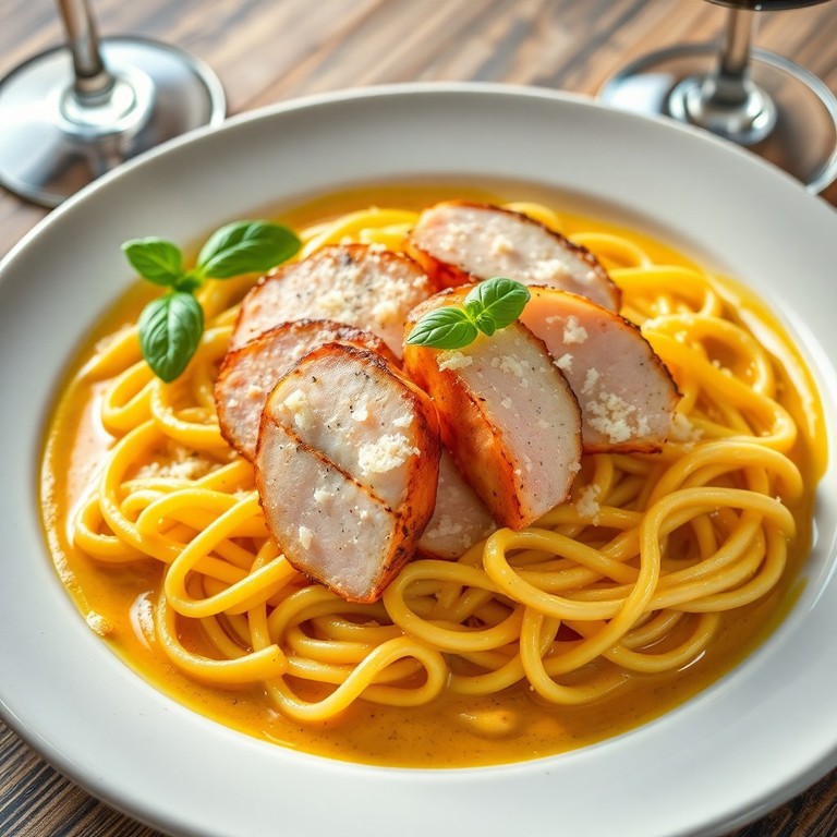 - Pasta a la Huancaína Trufada con Solomito Flambeado al Pisco