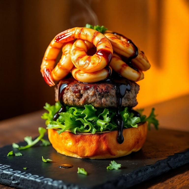 Hamburguesa de Cordero con Camarones al Ajillo y Reducción Balsámica