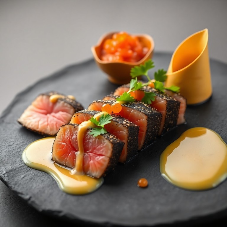 Salmón Tataki con Salsa de Lima y Huevas