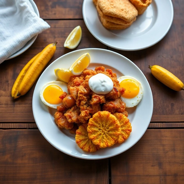 Chicharrón Crujiente con Arepas y Huevos Frescos