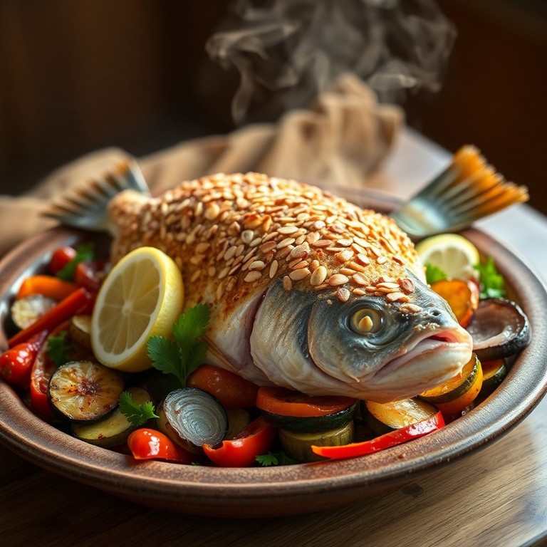 - Lubina al Horno con Costra de Almendras y Verduras Asadas