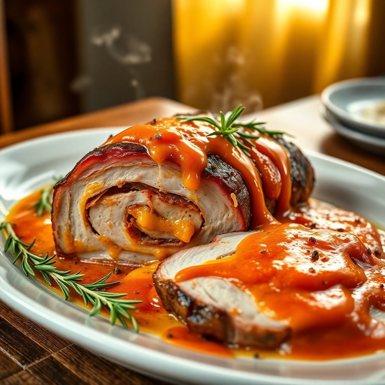 - Cinta de Lomo Rellena de Jamón y Queso con Salsa de Pimientos