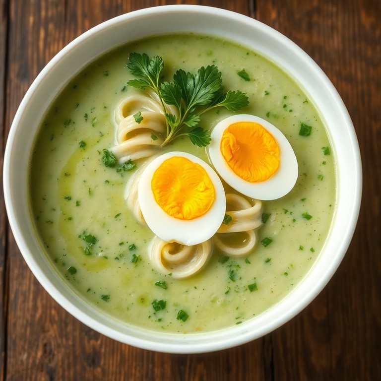 Sopa caliente de espinaca y huevo con hierbas frescas