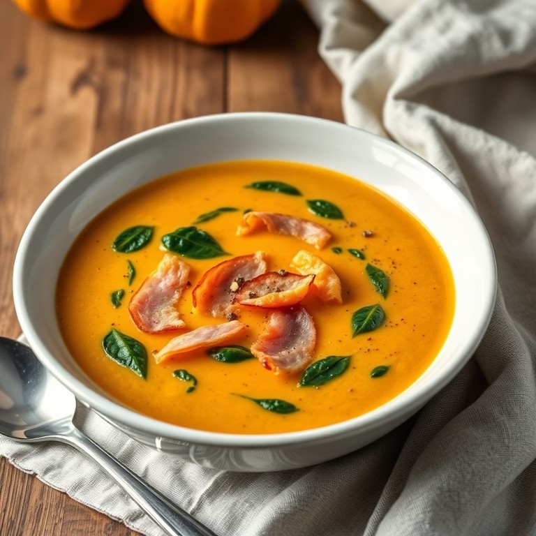 Sopa reconfortante de calabaza y espinaca con crujiente de jamón de pavo
