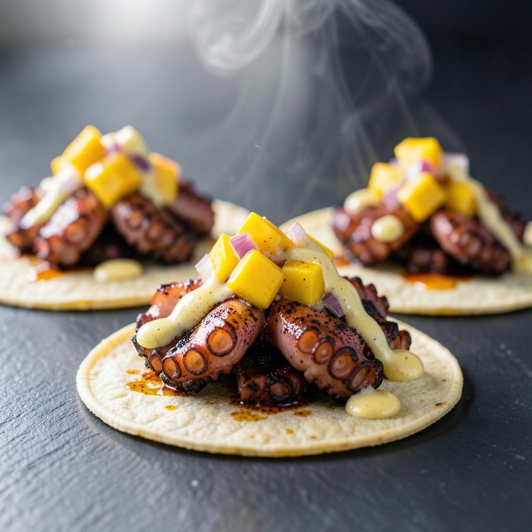 Tacos de Pulpo a la Parrilla con Alioli de Azafrán y Pico de Gallo de Mango