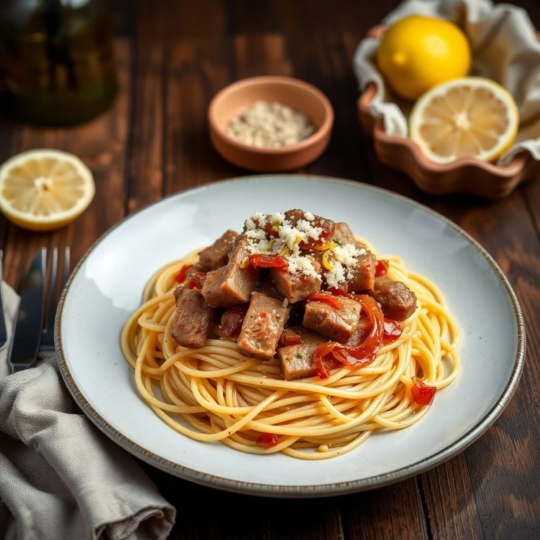Spaghetti con Cerdo y Cebolla Caramelizada