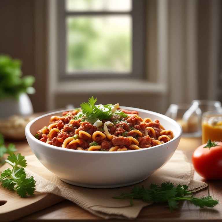 Macarrão Cremoso com Carne Moída, Molho de Tomate, Cheiro Verde e Alho