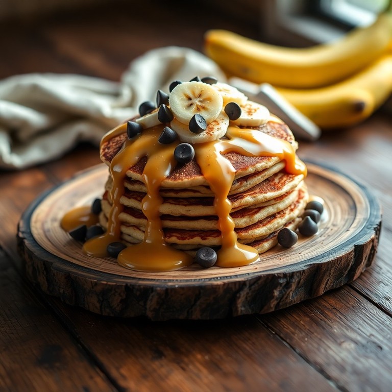 Panqueques de Avena y Plátano con Drizzle de Crema de Cacahuate y Chispas de Chocolate Negro