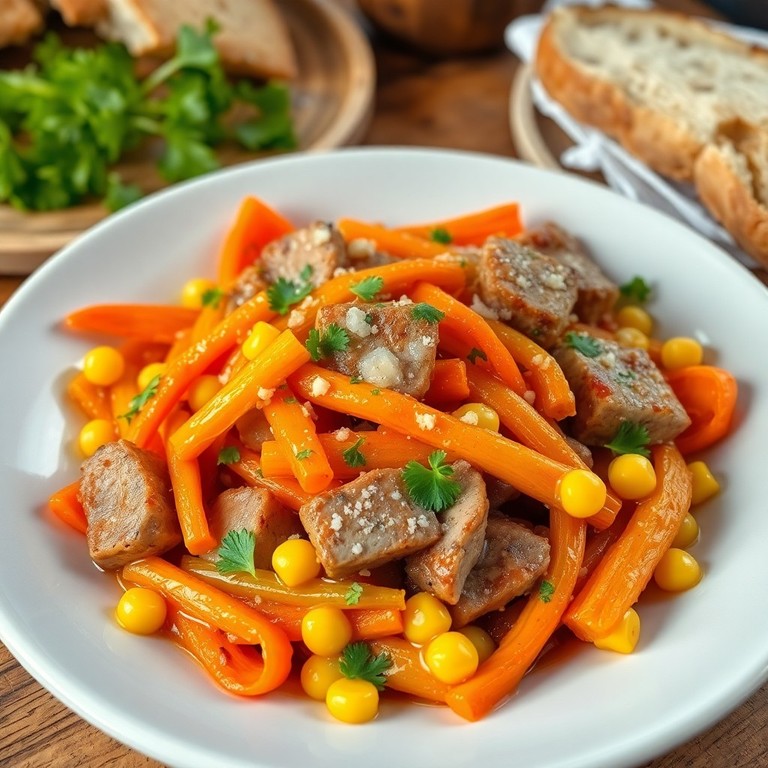 Salteado de Maíz, Zanahoria y Cinta de Lomo con Ajo y Perejil