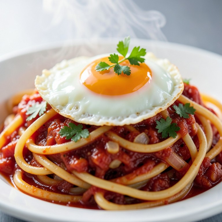 Fideos con Salsa de Tomate y Huevo Escalfado