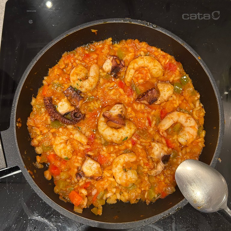 Arroz con Pulpo y Langostinos en Salsa de Pimientos y Cebolla