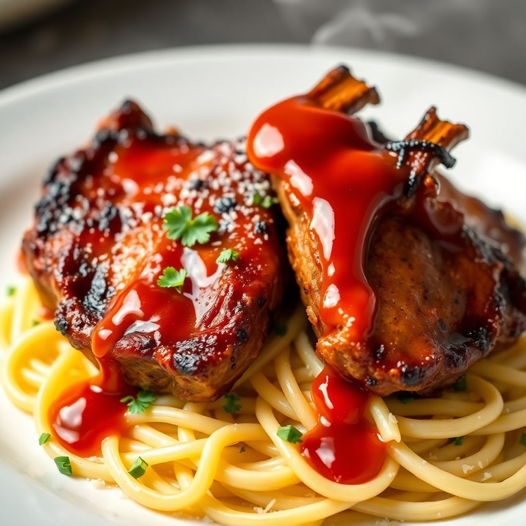 Chuletas Ahumadas Glaseadas con Salsa de Ajo y Ají sobre Pasta Cremosa
