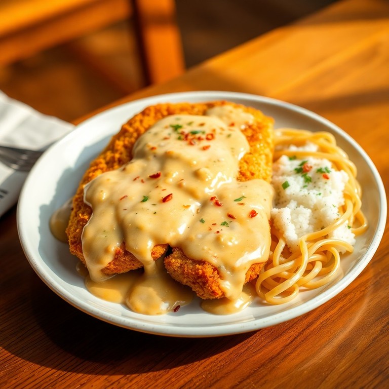 Pollo empanizado con salsa cremosa de ajo y cebolla