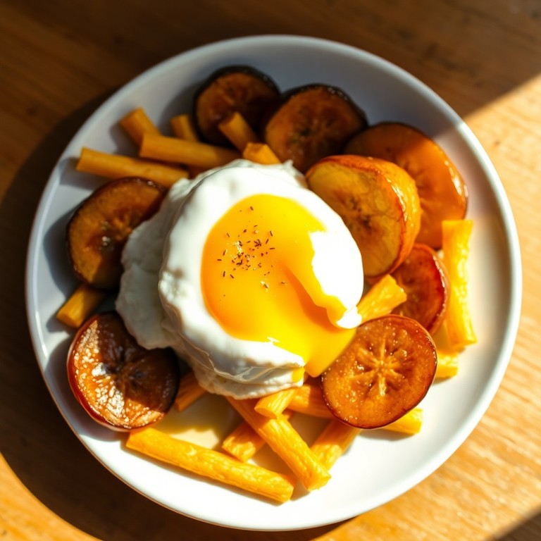 Desayuno Inglés Completo con Plátanos Fritos Realistas y Café en Plato y Taza Grises