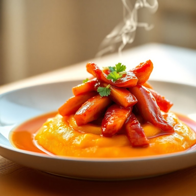 Tiras de Pollo Salteadas con Kétchup, Piña y Vegetales, sobre Puré de Manzana y Zanahoria