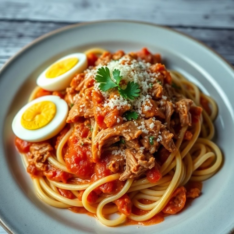 Macarrão ao Molho de Tomate com Pernil Suíno e Ovo
