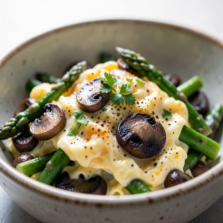 Revuelto clásico de champiñones y espárragos