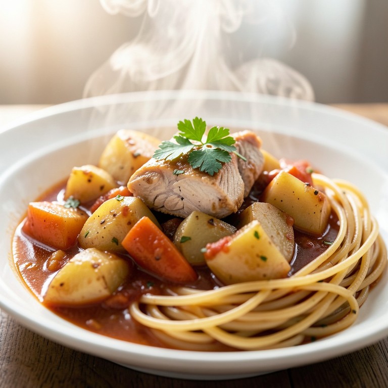 Estofado de Pollo y Papas con Chayote y Espagueti