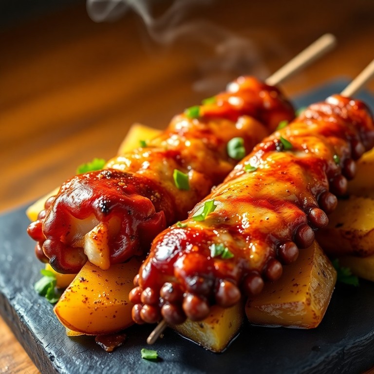 Brochetas de Pulpo Marinadas y Gratinadas con Papas Rústicas al Estilo Parmentier